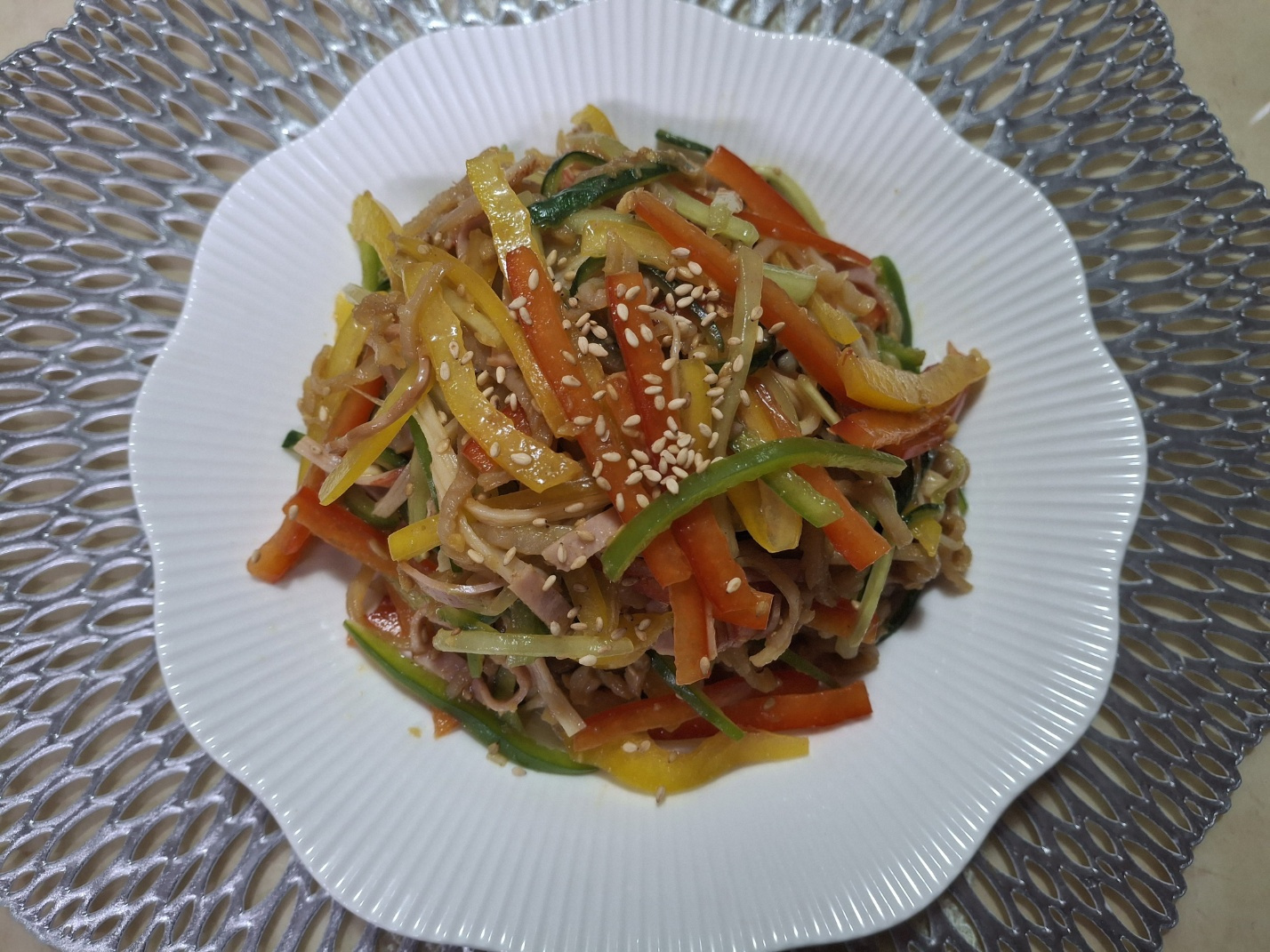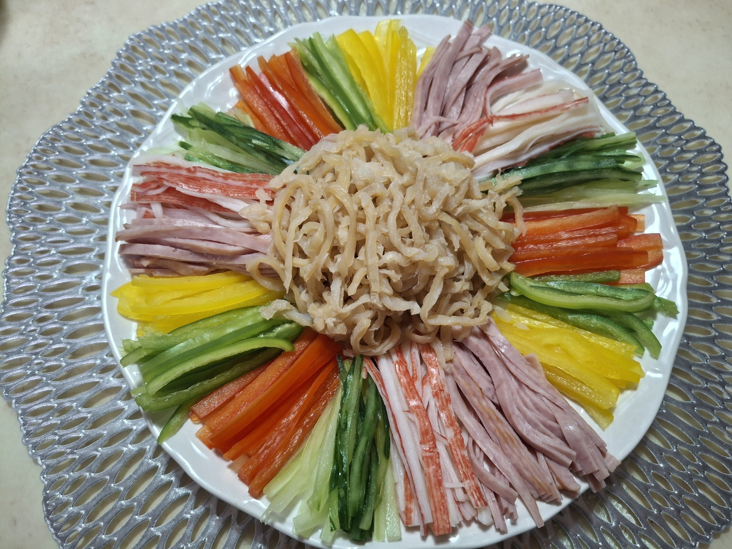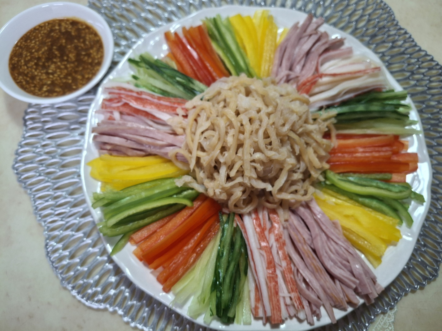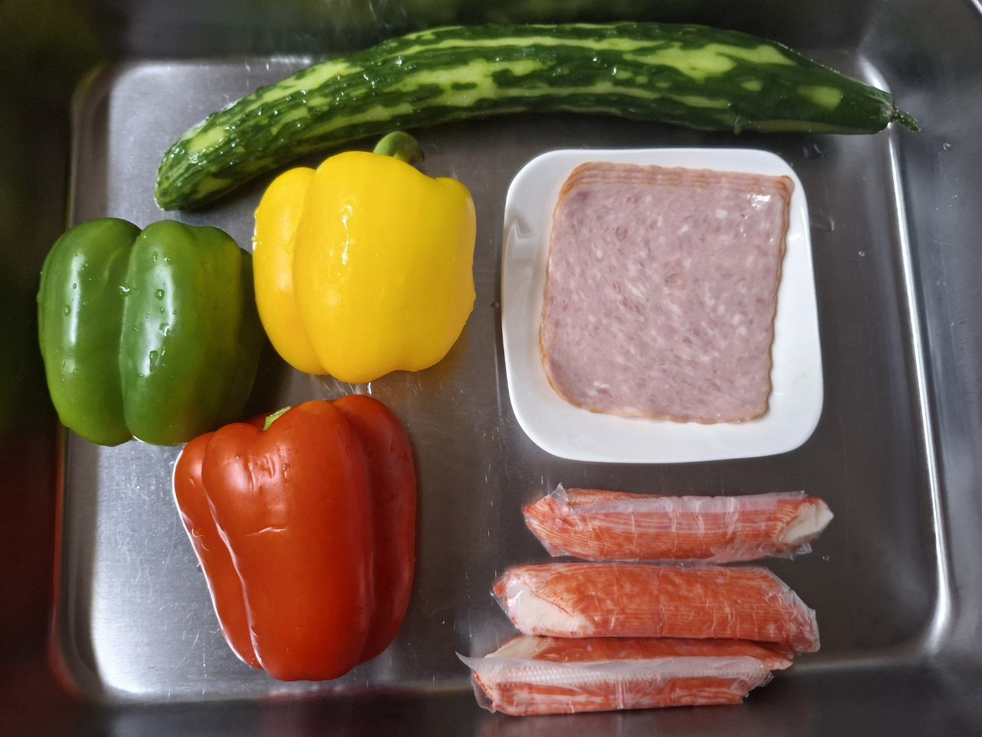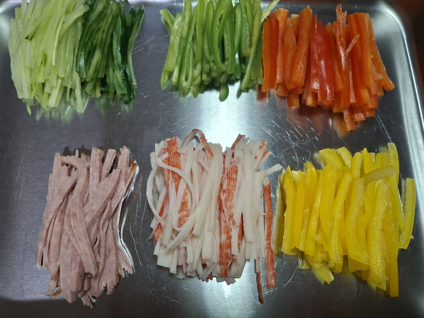 파프리카 빨강 1/2개, 파프리카 노랑 1/2개, 파프리카 초록 1/2개, 가시오이 1/2개, 맛살 70g, 슬라이스 햄 45g