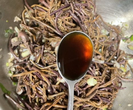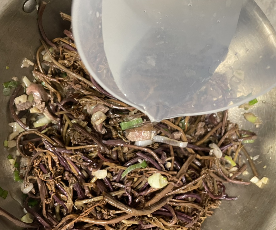 소고기가 핏기가 없어질 정도로 볶아지면 , 불린 고사리를 넣고 국간장과 액젓을 넣고 물을 100ml 정도 넣어 주세요.