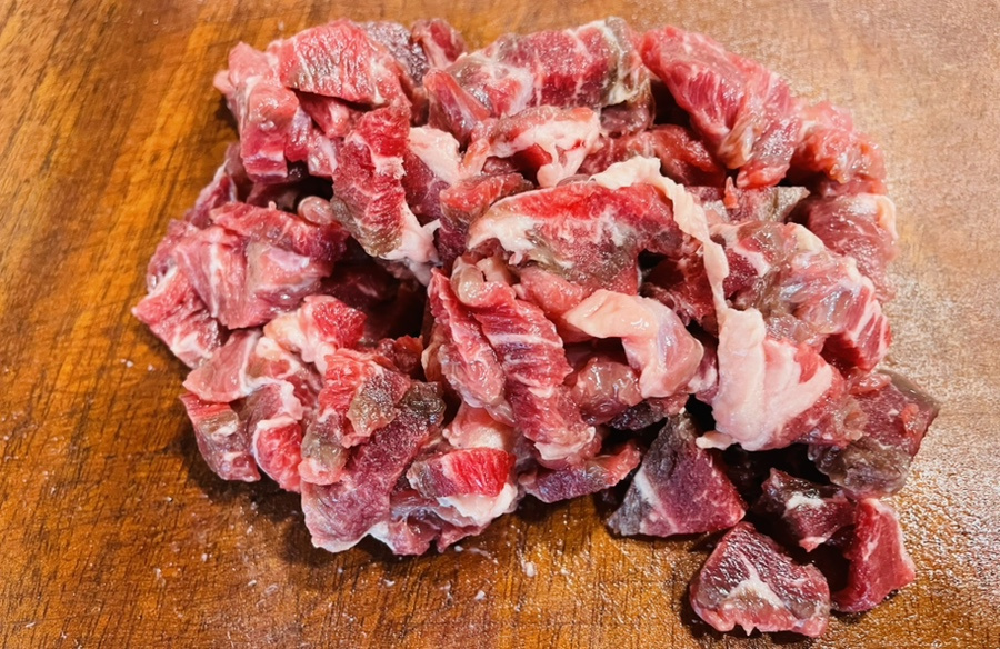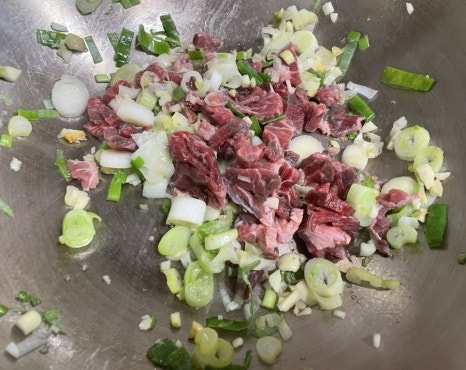 소고기 국거리도 잘게 다져 주세요. 다짐육을 사용하면 더 편해요.