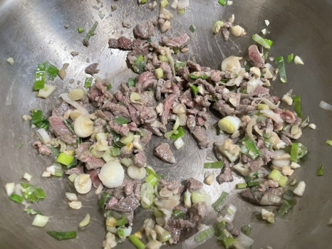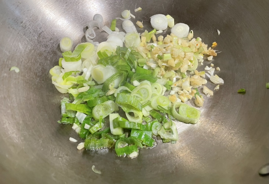 냄비나 후라이팬에 오일 넉넉하게 두르고 대파와 마늘을 볶아 주세요.