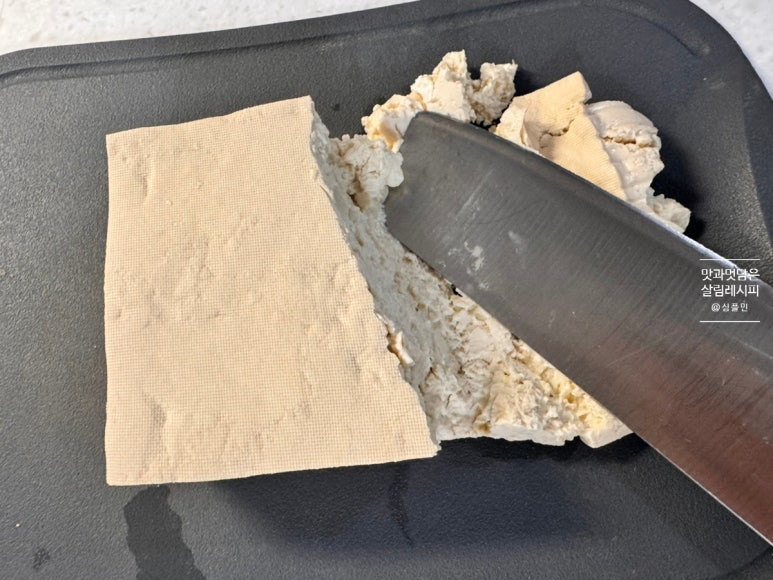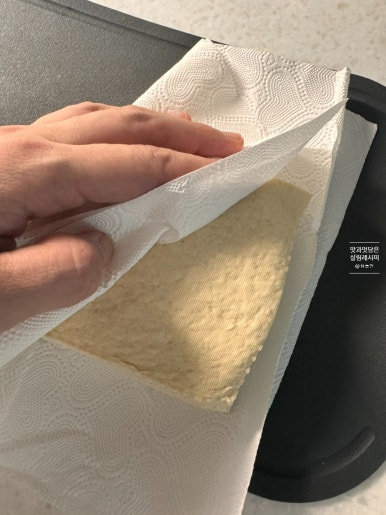 다음 키친타월로 핏물을 꼼꼼하게 흡수시켜 잡내를 잡고 반죽이 질척하지 않도록 해줍니다.두부는 미리 수분을 말끔하게 제거해서 으깨 넣어주는 것이 중요해요. 생각보다 수분이 많기 때문에 채반에 두고 충분히 제거해 준 뒤 면보나 키친타월로 다시 한번 꼼꼼하게 흡수시킵니다.칼로 으깨 줍니다. 완전히 곱게 으깨지 않아도 재료 섞는 과정에서 고르게 으깰 수 있어요.