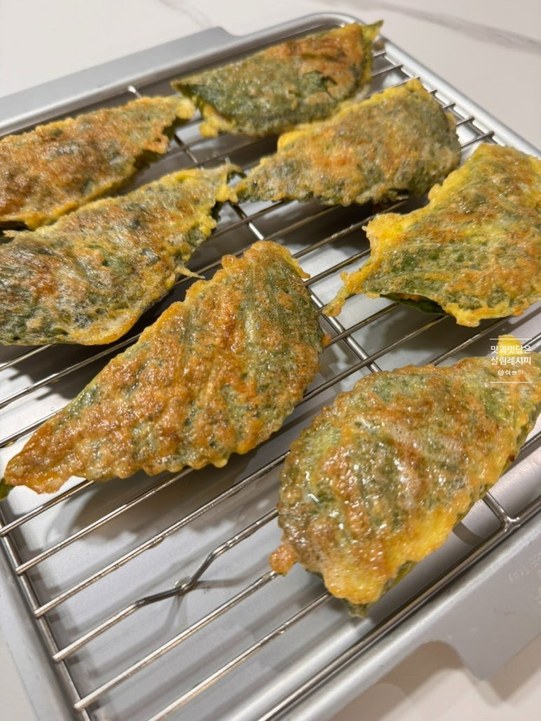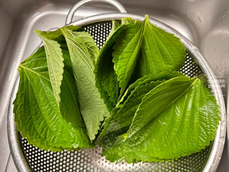깻잎전에도 반죽재료를 활용해 만들어 주기 위해 미리 씻어 채반에 놓고 물기를 제거해 주었어요.
