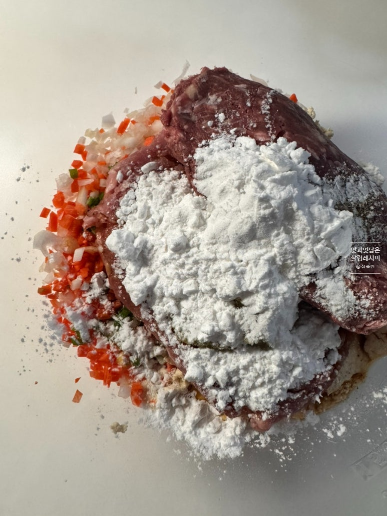 다진 야채와 함께 핏물을 제거한 다짐육 그리고 으깬 두부를 넣고 위 분량의 재료를 넣어줍니다. 전분가루도 이때 함께 넣어 농도를 맞춰주는데요. 수분량에 따라 너무 질퍽하다면 가루의 양을 좀 더 넣어줍니다. 또한 전분가루 대신 부침가루나 밀가루를 넣어주어도 좋아요.