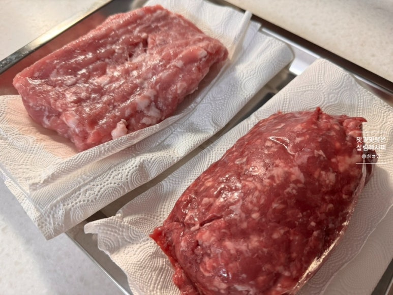 돼지고기와 소고기 300g 각각 준비하였어요. 비율을 달리해도 좋은데요. 이렇게 섞어 넣으면 단백한 맛과 부드러운 식감 모두 잡을 수 있어요. 합쳐서 한 근 분량 준비합니다.