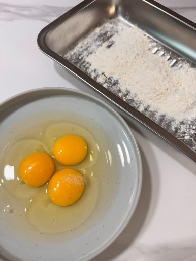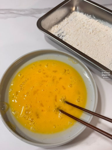 덧가루와 함께 입혀줄 달걀도 고루 풀어주는데요. 깻잎 전까지 만들면 달걀이 더 필요해요. 먼저 3개 정도 깨뜨려 풀어주고 하면서 부족할 경우엔 한두 개 더 추가해 주는 것을 추천합니다. 부침가루도 한 컵 분량 넓은 트레이나 쟁반에 준비합니다.