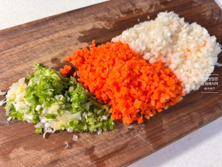 대파 1대, 당근과 양파 각각 반개를 준비해 아주 잘게 다지듯 썰어주었어요. 다지기를 활용해도 좋고요. 직접 썰어도 좋은데요. 다짐육과 고루 어우러지도록 잘게 준비해 줍니다.