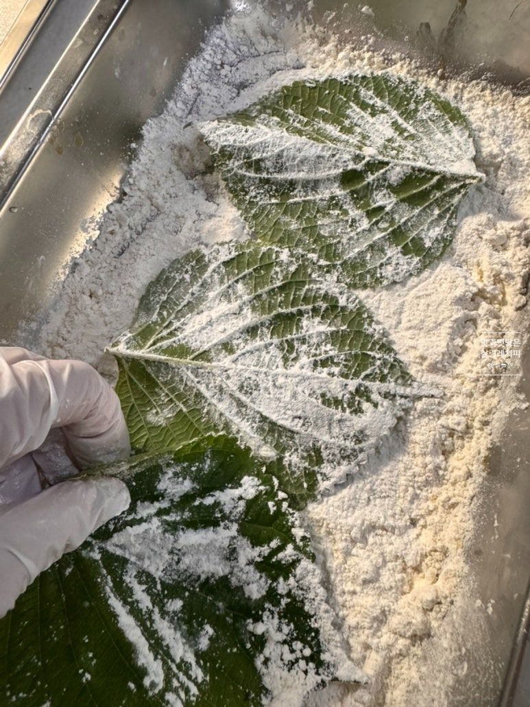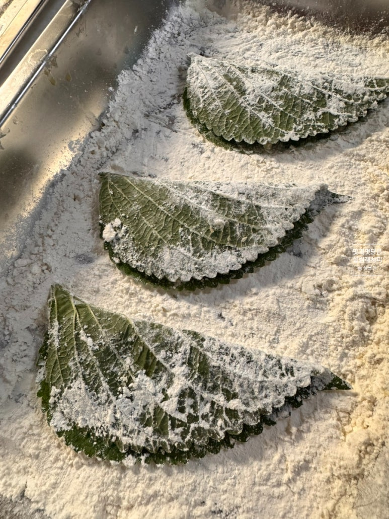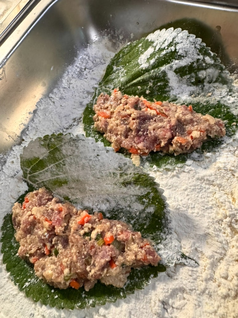깻잎 또한 앞뒤 덧가루 얇게 입혀줍니다.반죽재료 적당하게 올려주세요. 동일하게 너무 두껍지 않게 1cm 정도의 두께로 테두리 부분은 1cm 정도 남겨 채워줍니다.