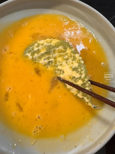 달걀물 앞뒤 고르게 덧바릅니다.