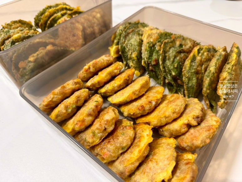 반찬으로도 좋지만 술안주 메뉴로도 좋고요. 다짐육 듬뿍 넣었기 때문에 단백질도 채울 수 있으면서 평소 아이들이 즐겨 하지 않는 야채도 잘게 다져 넣기 때문에 야채까지 고루 먹일 수 있어 좋습니다. 평소 자주 만들진 않지만 이렇게 명절연휴에 온 가족 둘러앉아 먹기 좋은 요리로 어렵지 않은 방법으로 맛있고 푸짐하게 만드는 전요리 차근차근 소개해 드립니다.