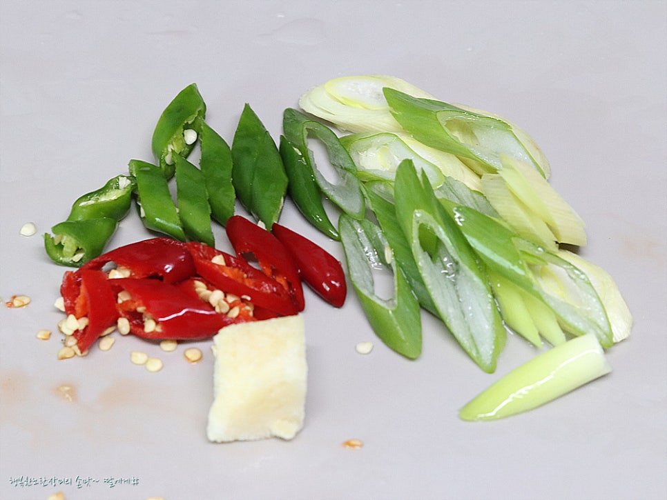 청양고추 1개, 홍청양고추1개 어슷썰어 준비