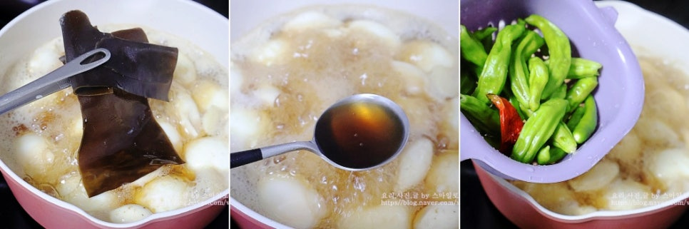 3분 정도 끓이다가 다시마는 건져내고 꽈리고추를 넣어줍니다