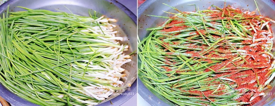 쪽파 표면에 남아있는 수분을 고춧가루가 흡착해서