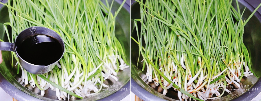 20분 정도 지나서 쪽파 줄기가 절여지면 쪽파에 부었던 꽃게 액젓을