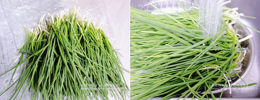 다듬은 쪽파는 물에 잠시 담갔다가 깨끗하게 2~3번 씻어건져 물기를 빼줍니다