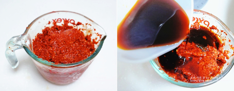 믹서기에 건더기 없이 곱게 갈아놓은 재료를 고춧가루와 함께 섞어주면