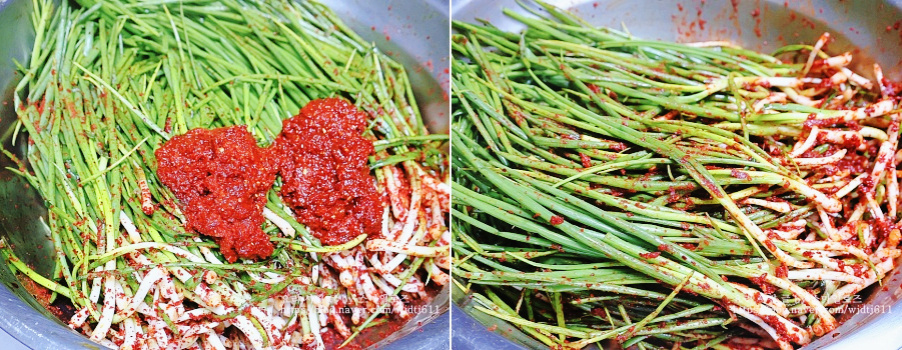 너무 세게 버무리다 보면 풋내가 날수 있기에 쪽파에 바르면서