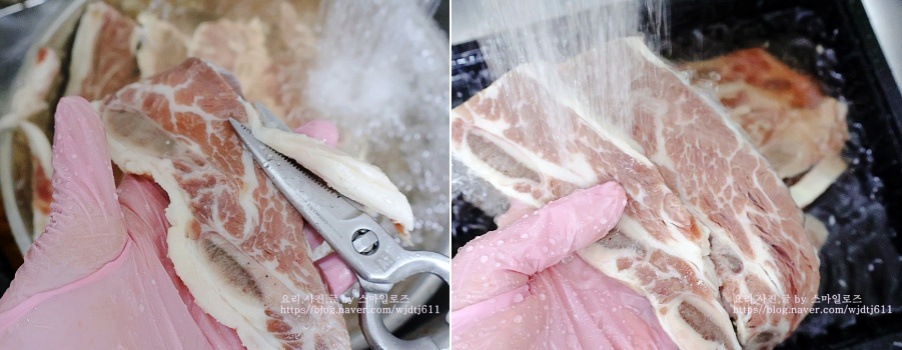 핏물 뺀 갈비는 기름이 많은 부위를 가위로 잘라내고