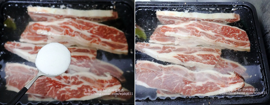 윗면에 핏물이 올라오면 뒤집어줍니다