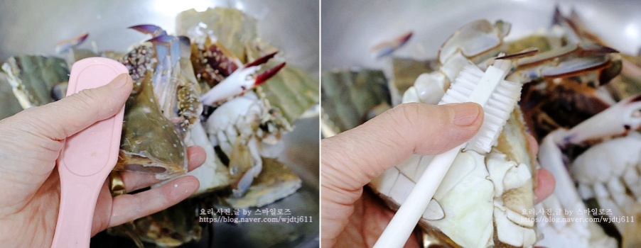 주방 솔을 이용하여 꽃게 겉면과 다리 사이를 깨끗하게 닦아주었어요