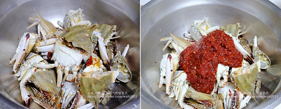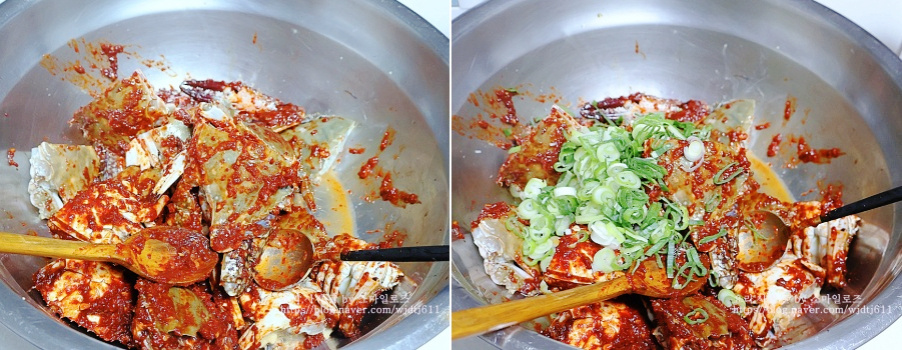 볼에 게를 담은 뒤 양념장을 넣어줍니다