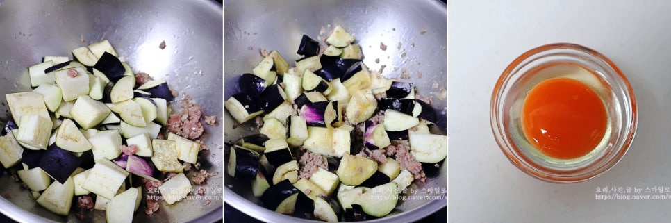 가지와 소고기 다짐육을 굴 소스로 양념해서 볶으면서