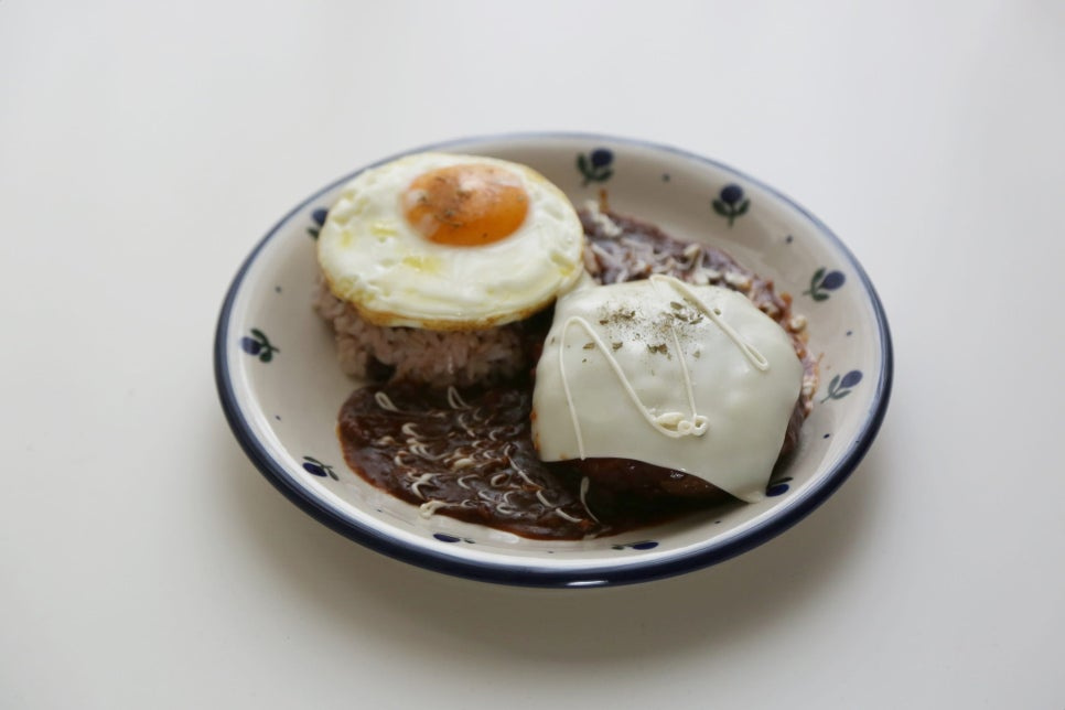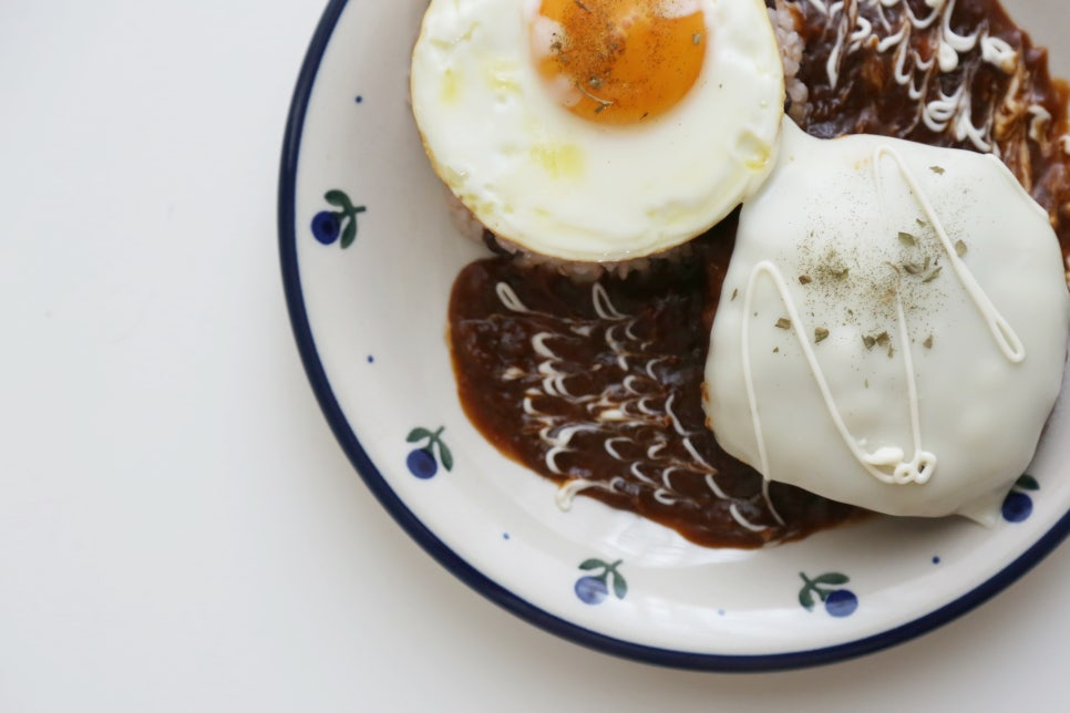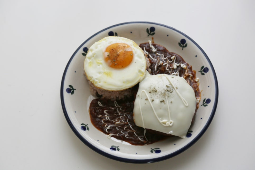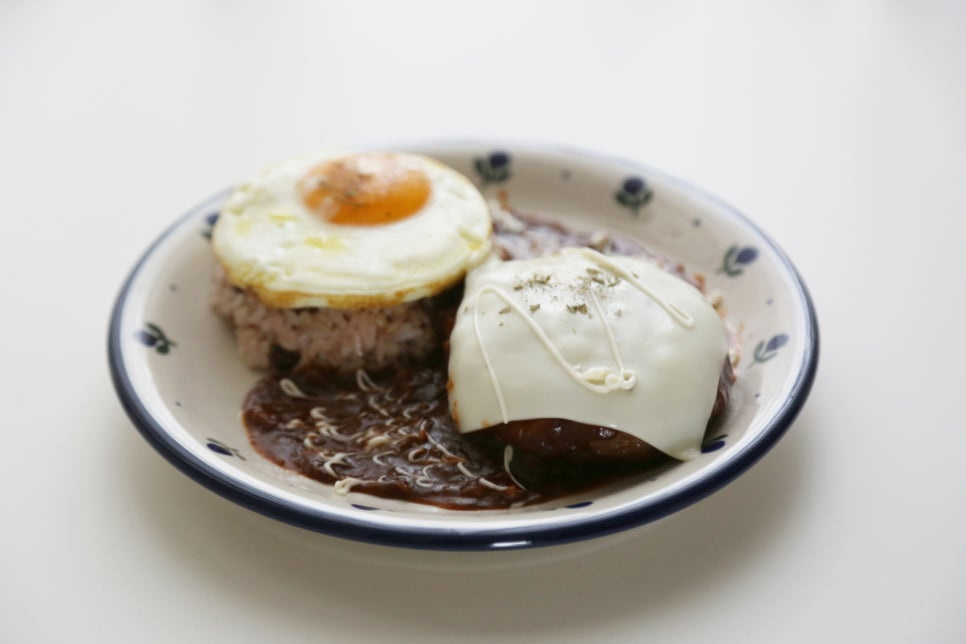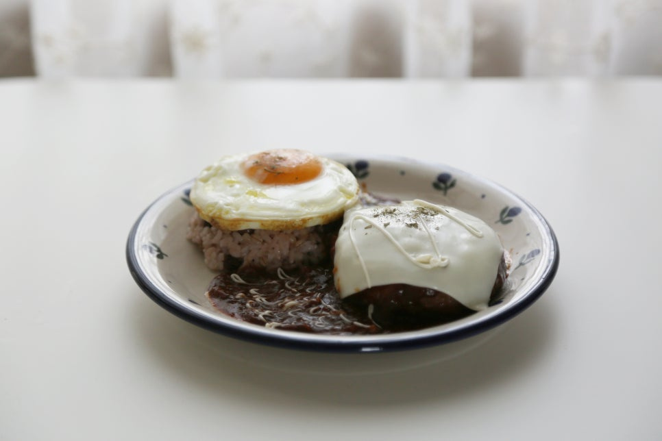 밥 1공기, 함박스테이크 1개, 계란후라이 1개, 체다슬라이스치즈 1장, 마요네즈 약간, 파슬리가루 약간
