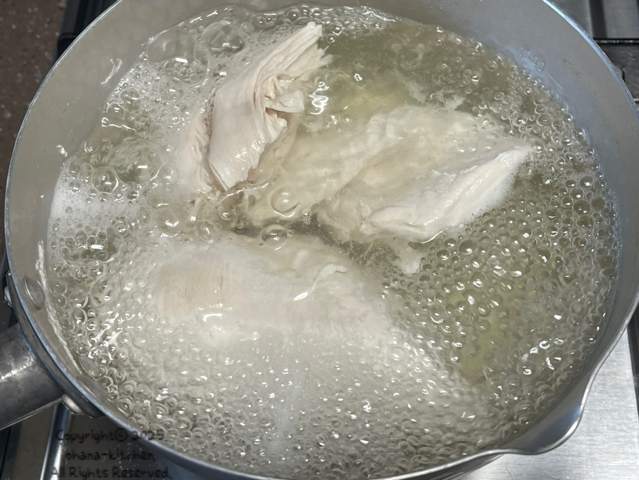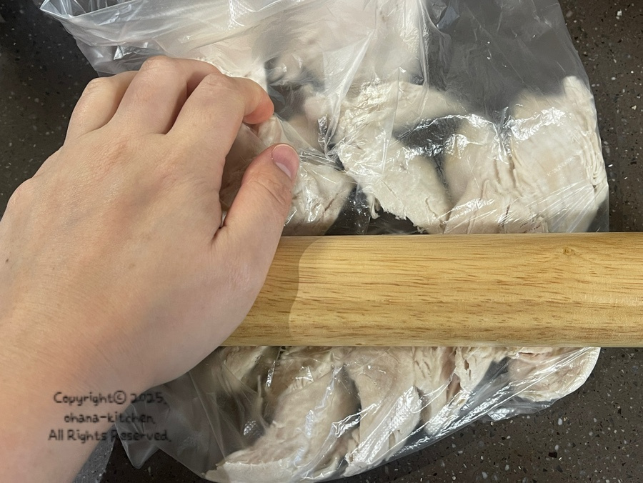 닭가슴살은 잘게 찢어 주셔야 하는데 하나하나 손으로 찢으면 너무 오래 걸리지만 위생봉투에 넣고 밀대로 밀어 주시면 금방 잘게 결대로 찢을 수 있어요.