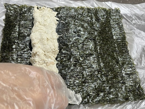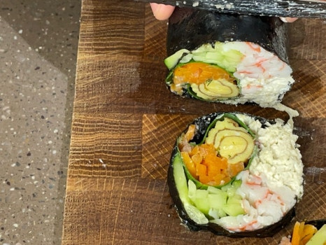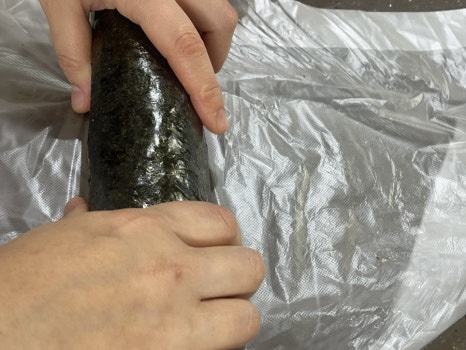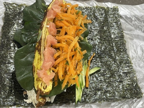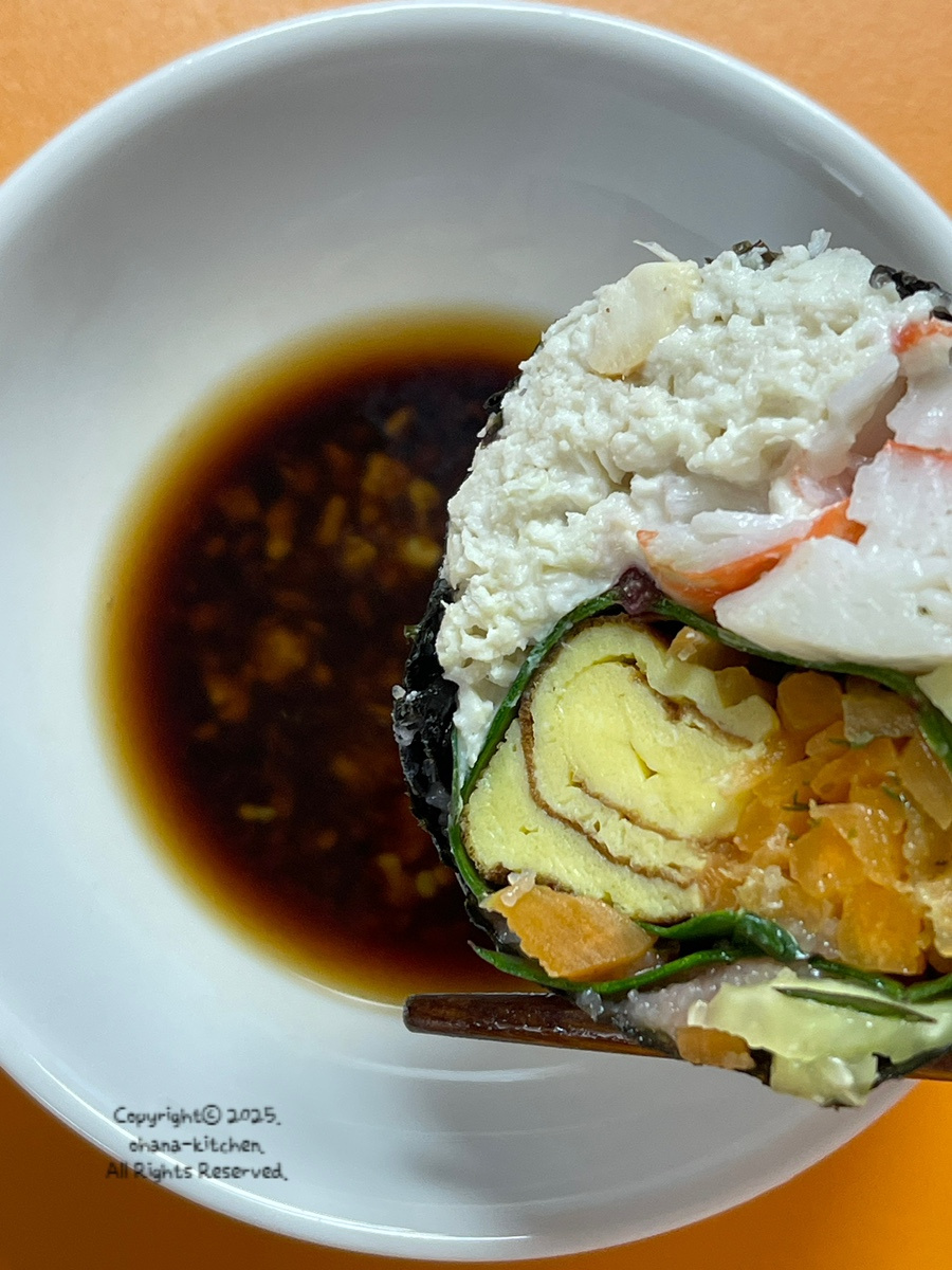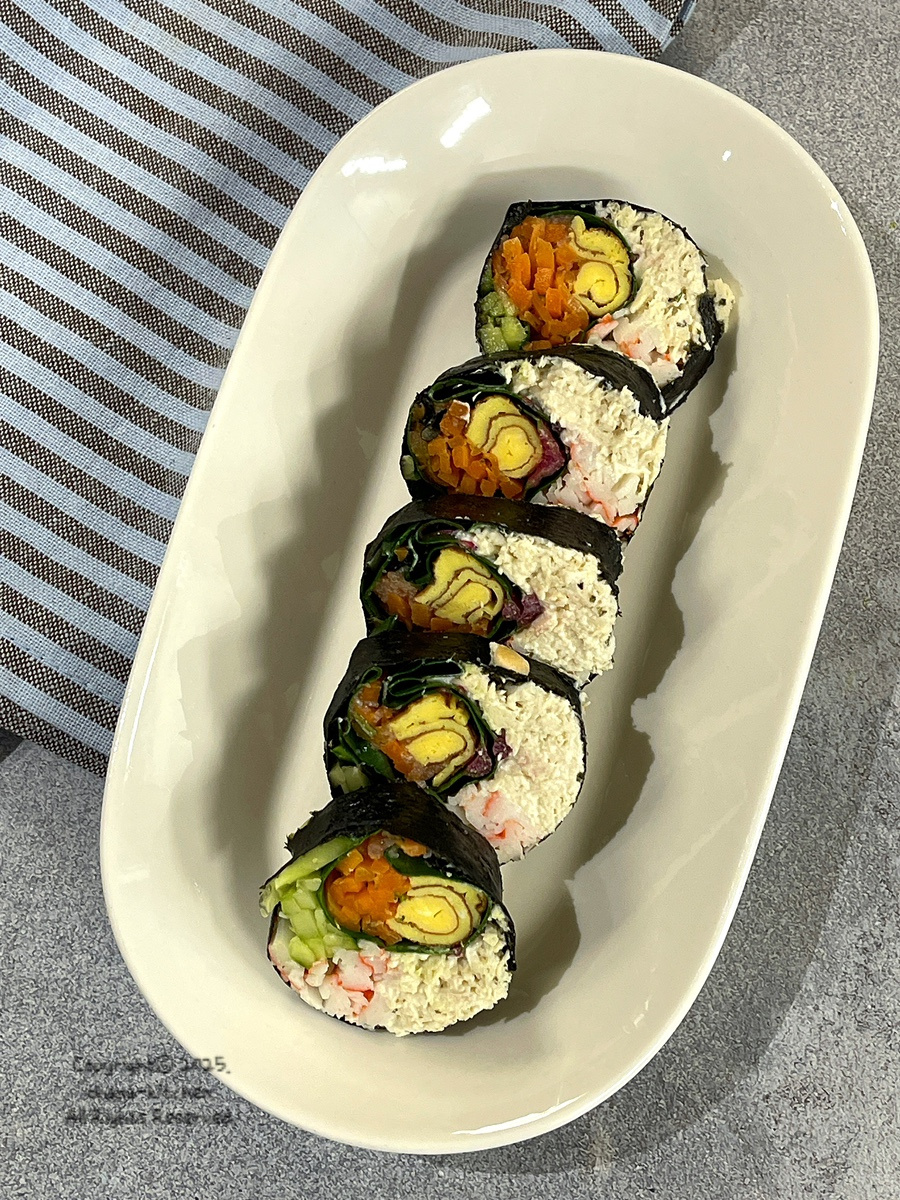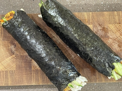 김밥김 위에 준비한 모든 재료를 넣고 한 번에 말아 준 뒤 들기름을 얇게 발라 먹기 좋은 크기로 썰어 주세요.