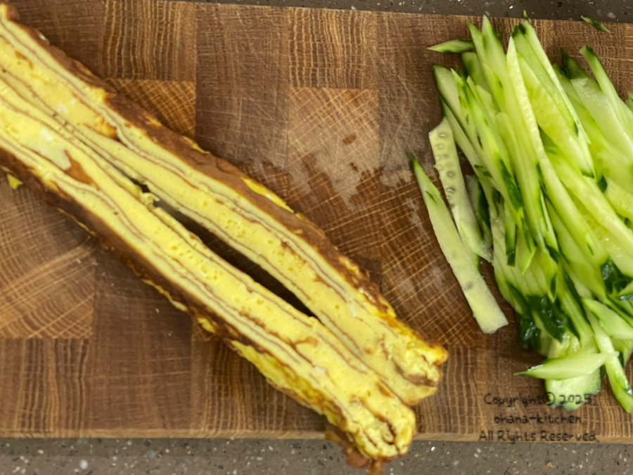 계란말이는 세로로 반 갈라 식혀 주시고 오이는 채썰어주세요.