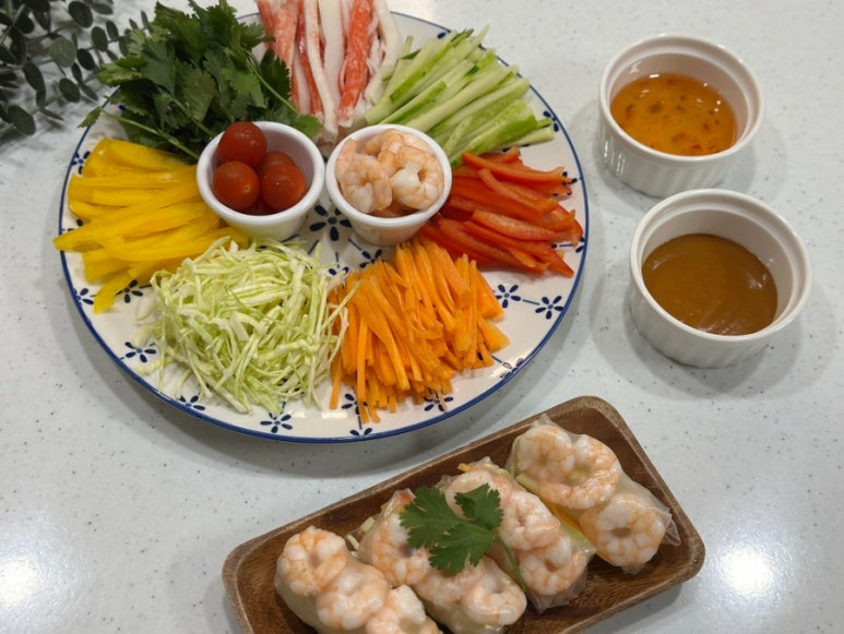 오늘은 냉장고 속 야채들을 찾아서 접시에 푸짐하게 올려준 다음 라이스페이퍼에 돌돌 말아서 월남쌈을 만들어 보았습니다. 다이어트 레시피로도 간단하게 만들어 먹기 좋은 월남쌈! 기호에 맞게 속 재료들을 넣고 라이스페이퍼로 말아서 소스에 콕 찍어 먹으면 입안 가득 감칠맛과 식감이 좋은 월남쌈을 만들어 먹어 볼게요 :)