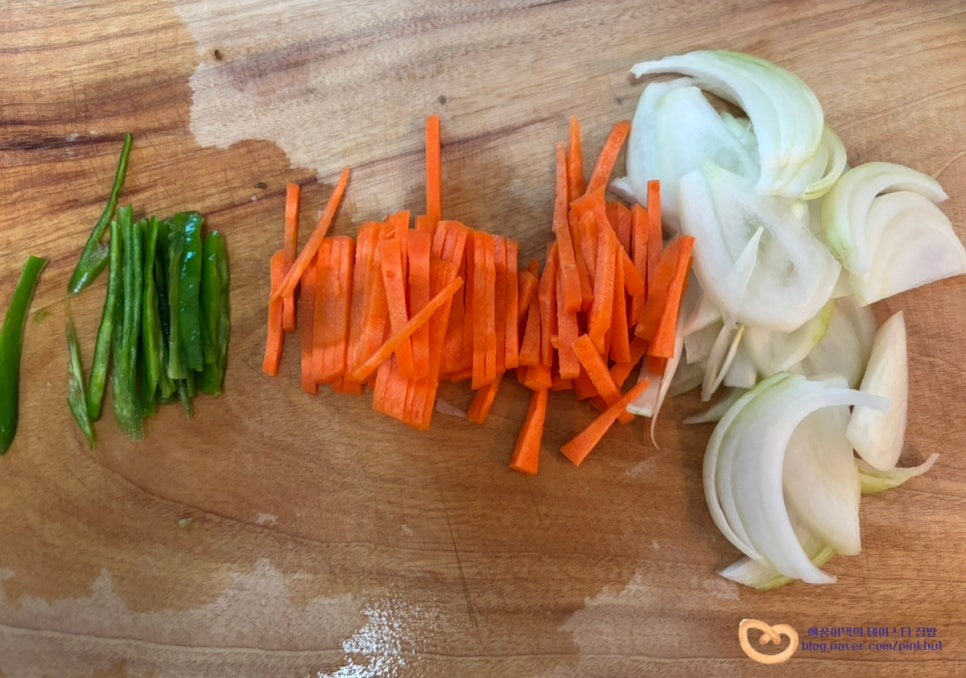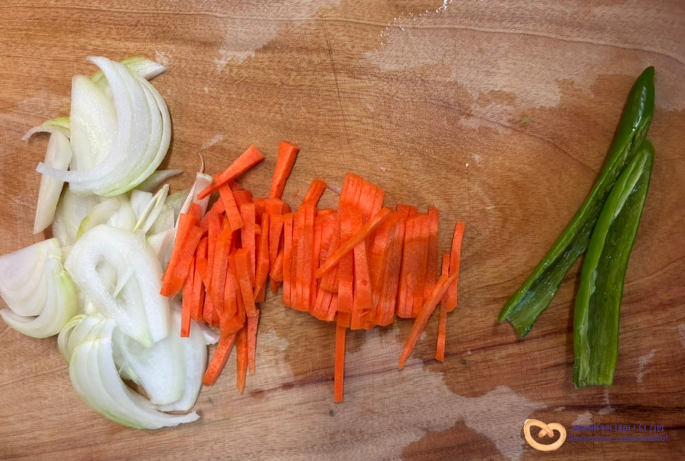 양파는 3mm 두께로 슬라이스하고, 당근은 좀 더 얇게 채 썰어주었어요. 풋고추는 씨를 제거하고 양파, 당근의 길이와 비슷하게 맞춰 세로로 길게 채 썰어주세요