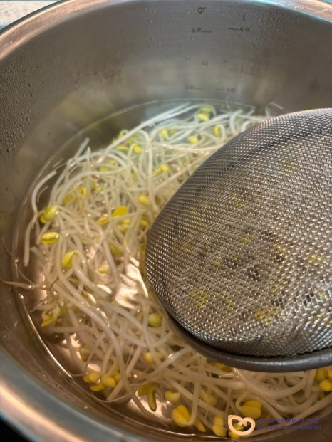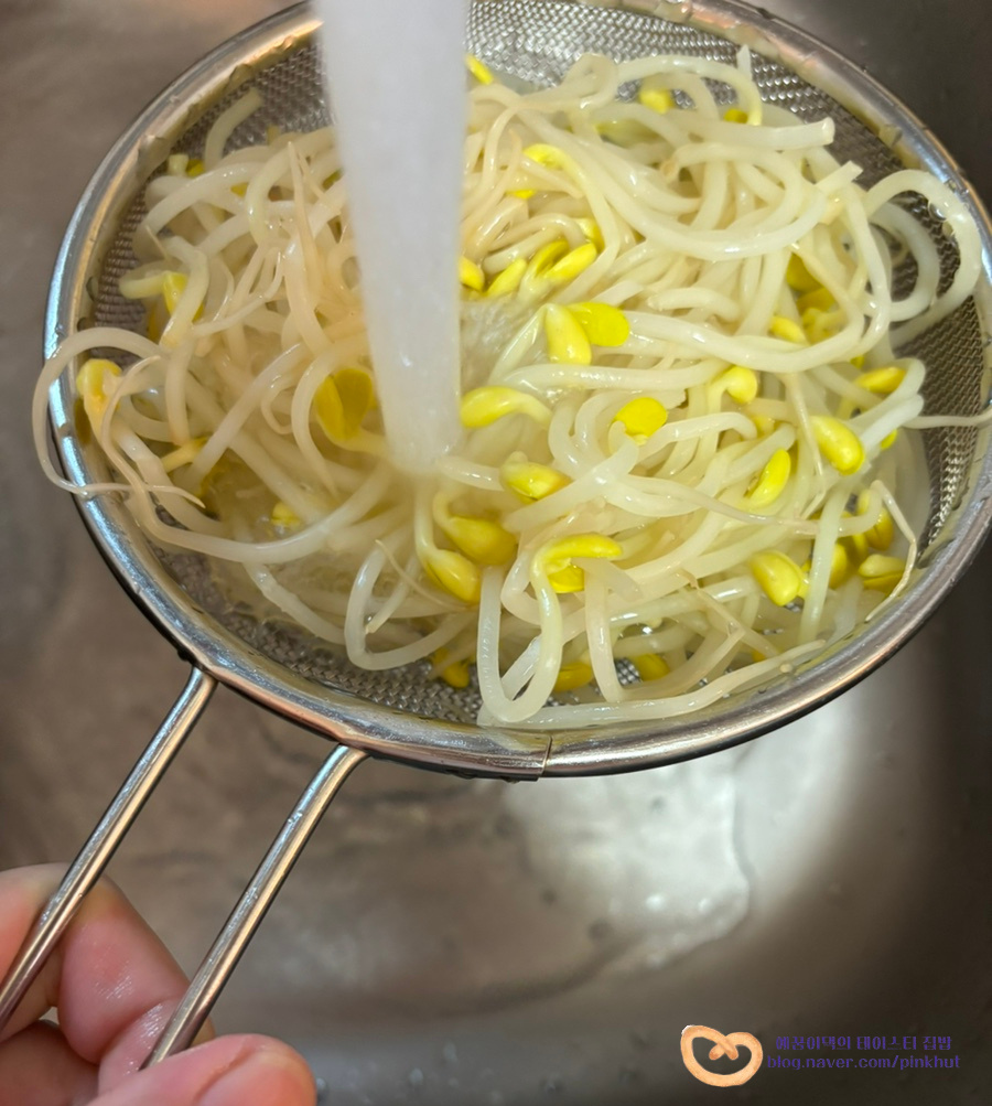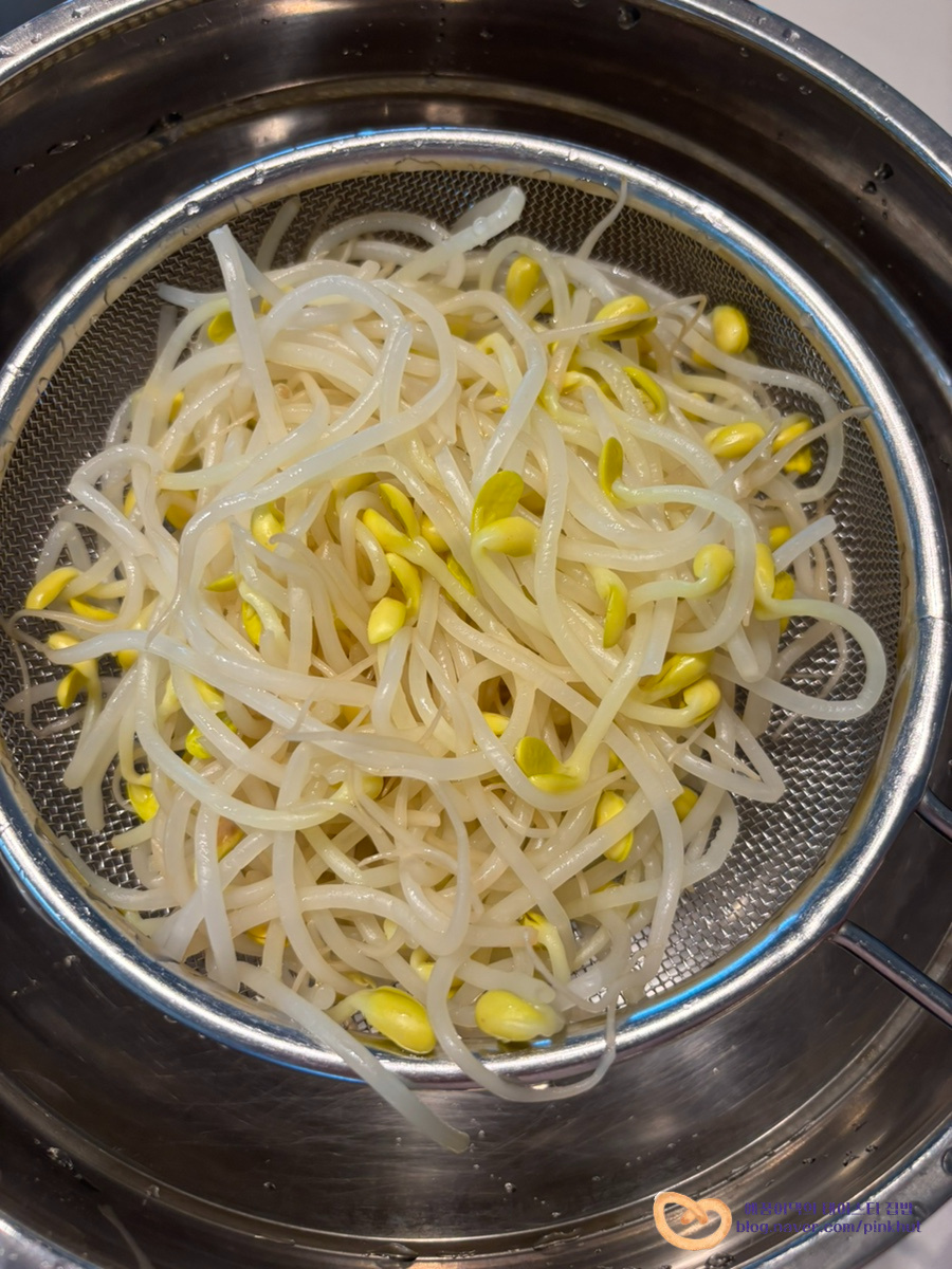 2분이 경과한 후에 바로 건져내어 찬물에 골고루 헹궈주고 물기를 가볍게 짜 내면 콩나물 손질 끝이에요. 이렇게 살짝 데친 후에 재료들과 함께 볶아주어야 아삭함이 살아있어 더욱 맛있어요 :)
