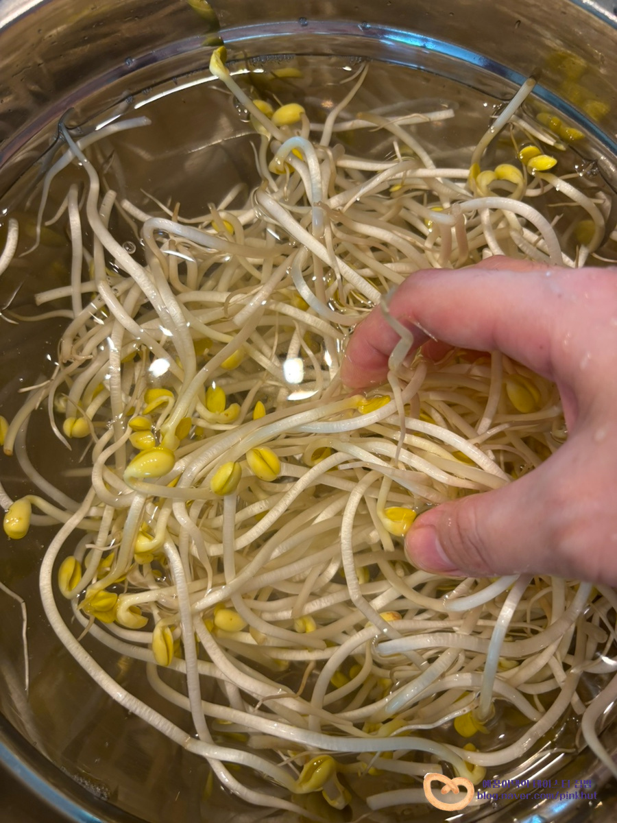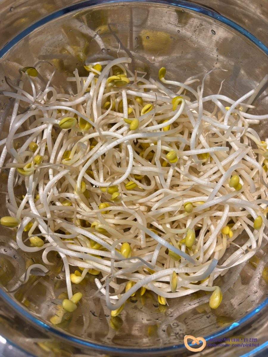 콩나물은 200g을 준비했어요. 볼에 물과 함께 콩나물을 담고 살살 흔들어가며 두세 번 세척해 주세요 물기를 빼서 소쿠리나 볼에 담아놓으면 세척 끝! 끓는물에 살짝 데쳐줄 거예요.