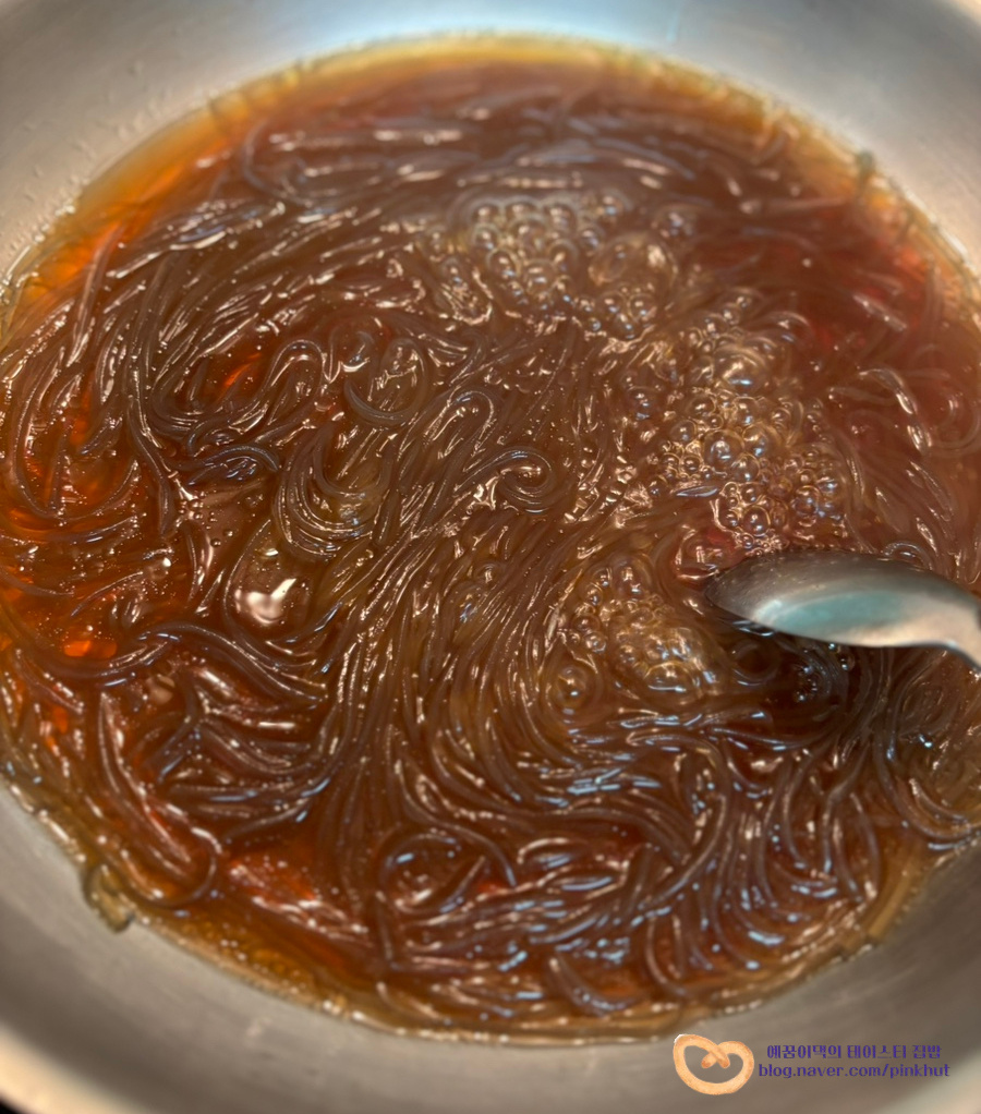 간장양념이 보글보글 끓어오르면 중불로 줄여 당면에 양념이 잘 스며들도록 숟가락으로 뒤적여가며 볶아주세요 소스가 당면에 충분히 배도록 볶아주는 과정이 중요해요. 이렇게 하면 불지 않고 면발이 탱글탱글한 잡채레시피 완성하실 수 있어요. 저는 중불에 2~3분간 볶아주었습니다