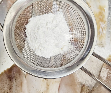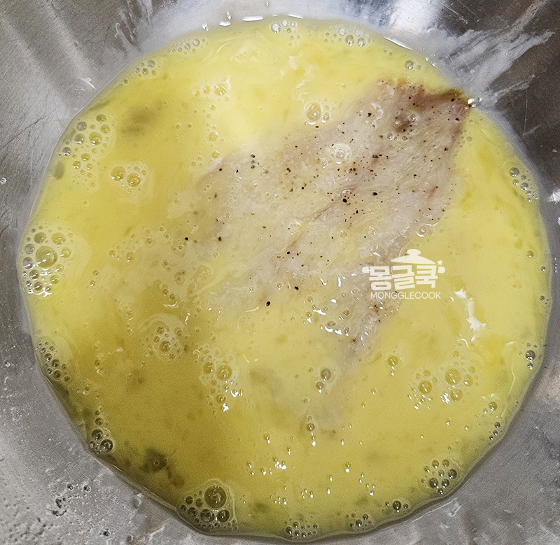 명태살 겉면에 밀가루를 얇게 묻혀 손으로 톡톡 털어내면 계란 물이 잘 붙어요.