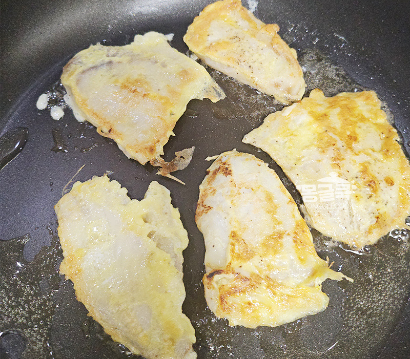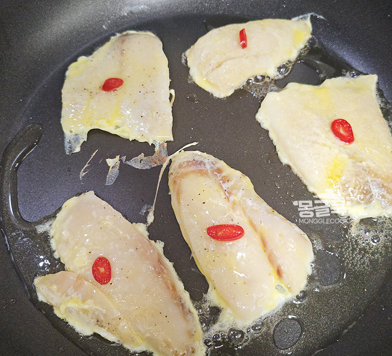 달군 팬에 식용유를 넉넉히 두른 뒤, 명태를 계란 물에 담갔다가 꺼내 팬에 올려주세요.