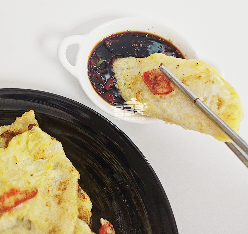 한쪽이 단단히 익기 전에는 뒤집지 말고, 겉이 노릇하게 익었을 때 뒤집어야 계란 옷이 벗겨지지 않아요.