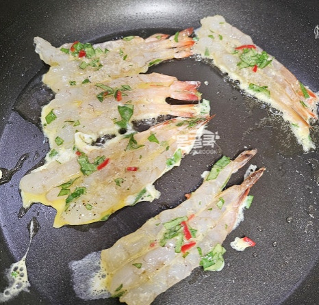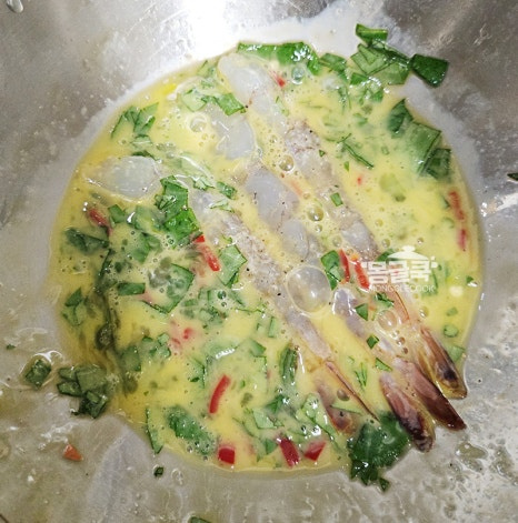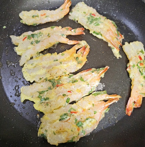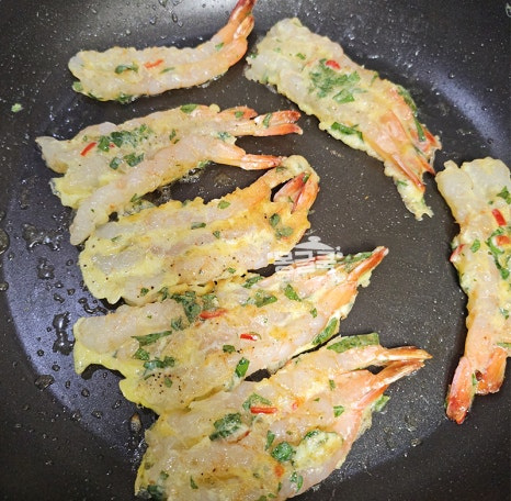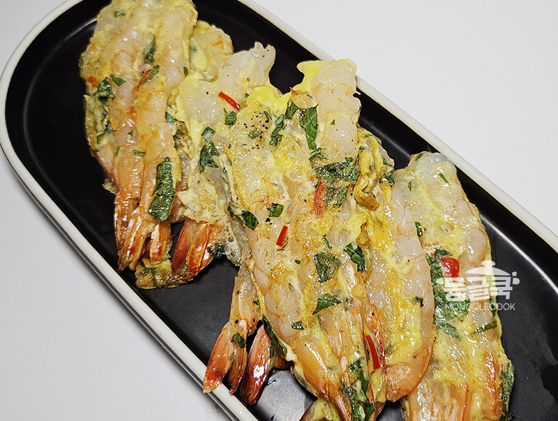 밀가루를 살짝 입힌 새우를 계란 물에 푹 담갔다가 기름을 두른 팬에 올려주세요.