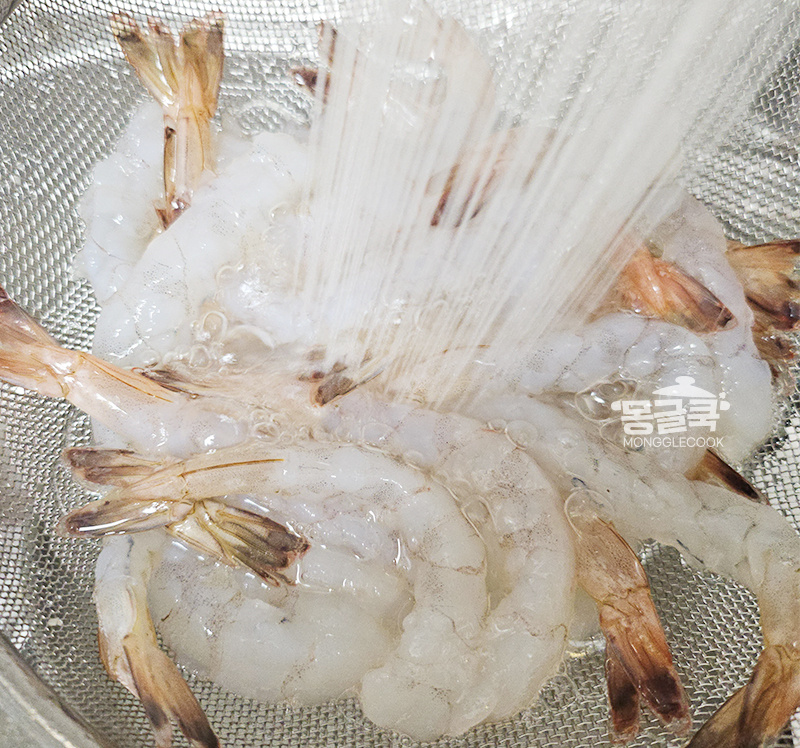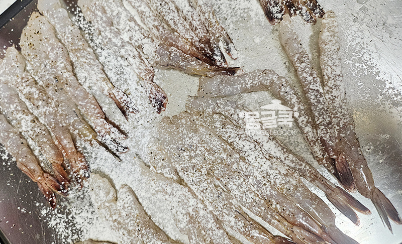 새우에 밀가루를 체로 얇게 뿌려주세요.