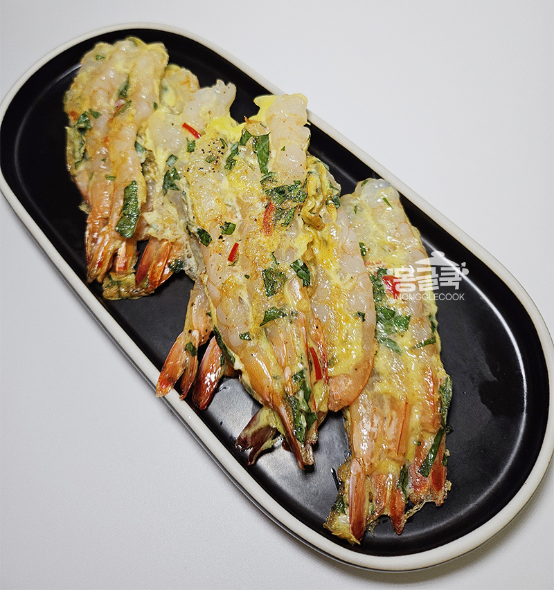 노바시새우를 2~3개씩 붙여 전처럼 부치면 훨씬 먹음직스럽고 보기에도 좋아요.