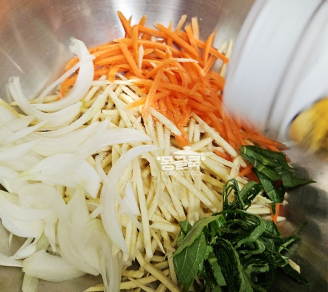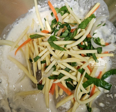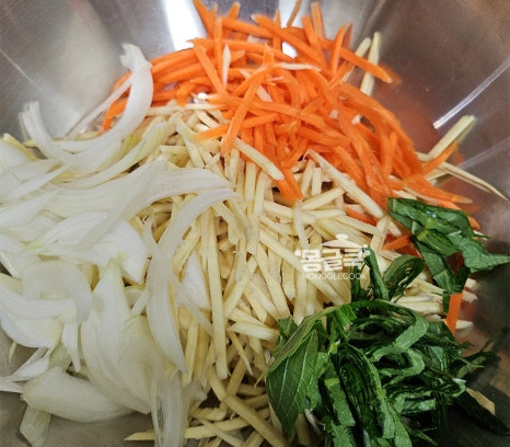 고구마, 양파, 당근은 얇게 채 썰어주세요.