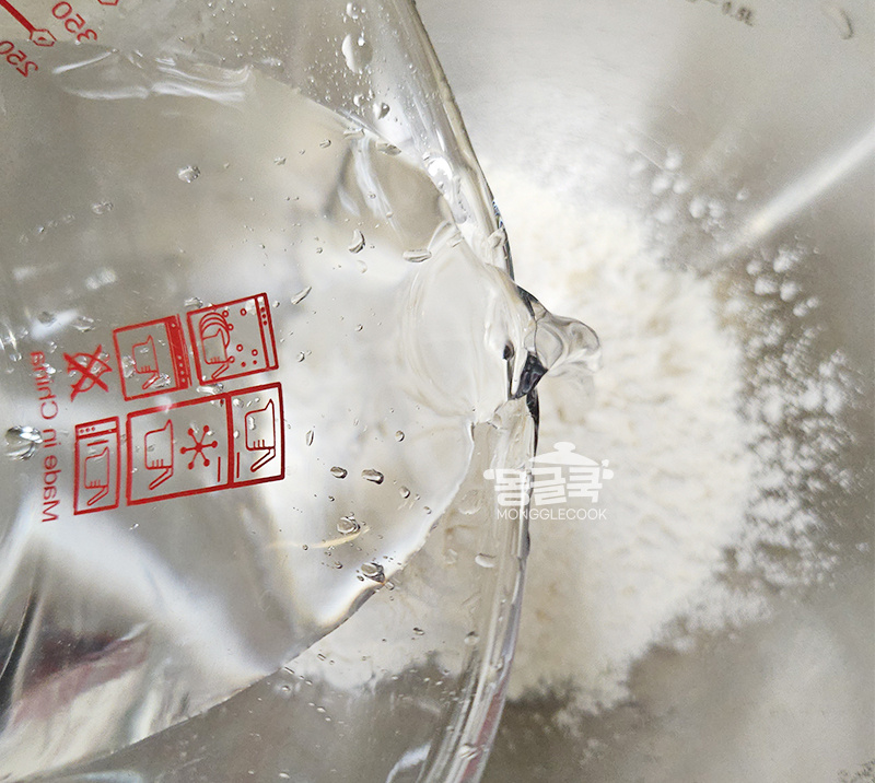 볼에 박력분과 차가운 물, 그리고 얼음을 넣고 젓가락으로 대충 섞어 주세요.