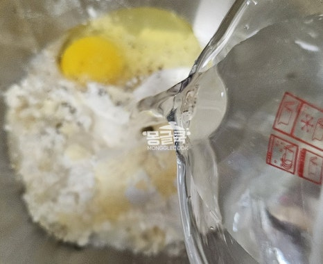 계란과 차가운 물을 넣어 살짝 묽은 농도로 반죽을 만들어주세요.