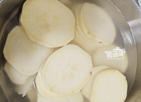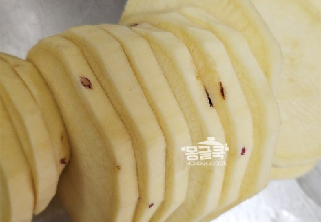 고구마는 껍질을 제거하고 0.5~0.7cm 두께로 잘라주세요.