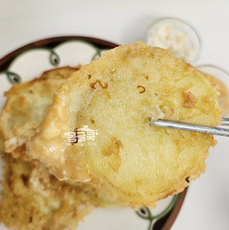 10분 정도 물에 담가 전부기를 빼주면 튀겼을 때 눅눅해지지않아요.