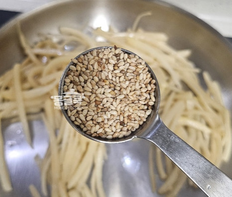 불을 끄고 참기름 1큰술, 간 깨 1큰술, 통깨 1큰술을 뿌려 고소하게 마무리해 주세요.