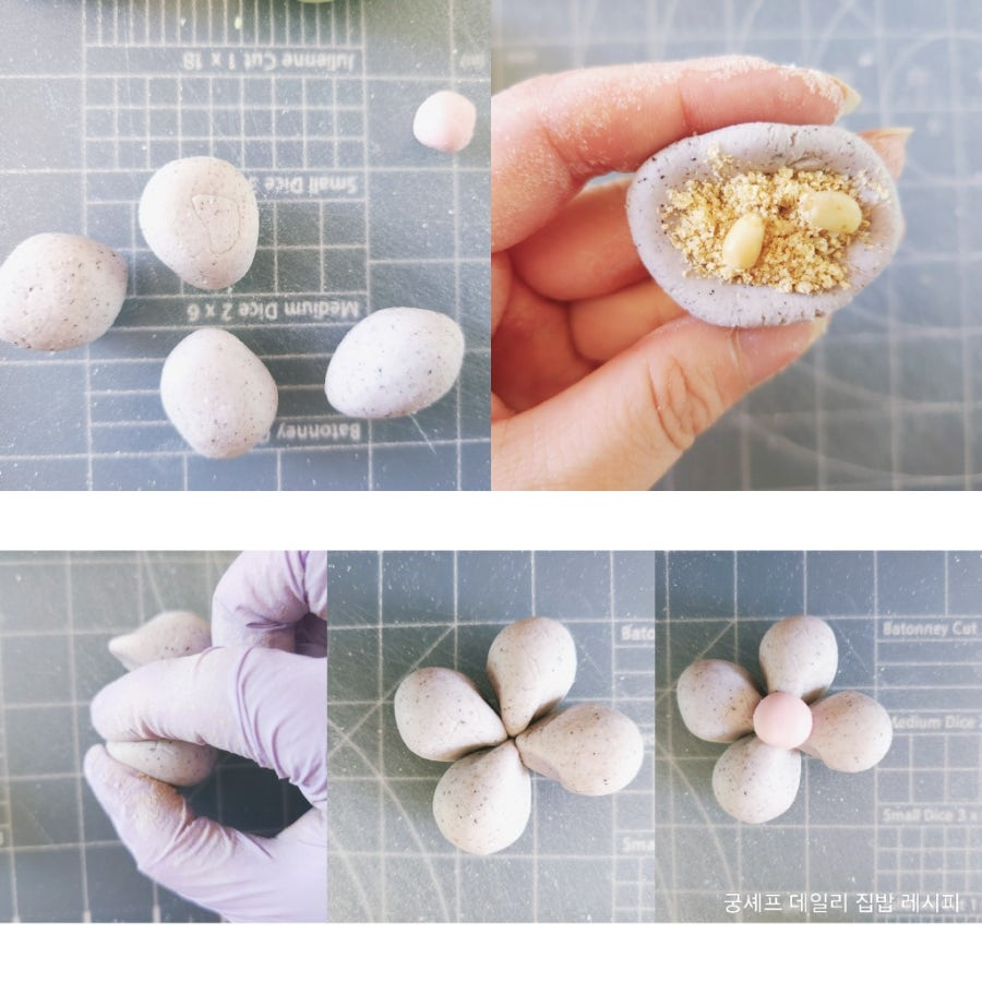 4)물방울 모양을 총 4개 만들면 꽃잎이 완성입니다. 가운데는 잣 하나 넣고 동그랗게 만들어 주세요.