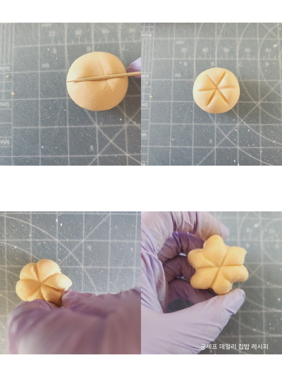 2) 꼬치로 십자모양으로 눌러주고 꽃잎의 수에 따라 십자모양을 중심으로 선을 더 만들어 주세요.
