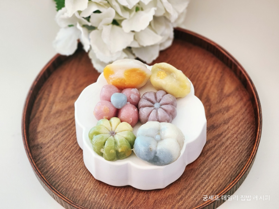 6) 다른색 반죽을 소량 떼어내서 동글동글 만들어 준뒤 송편에 붙여 주세요.