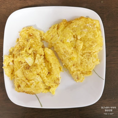 스크램블 에그를 천천히 만들어주신다고 생각하고 큰 덩어리로 뭉쳐주세요. 다 익기 전에 불을 꺼주셔야 촉촉하게 만들 수 있어요.